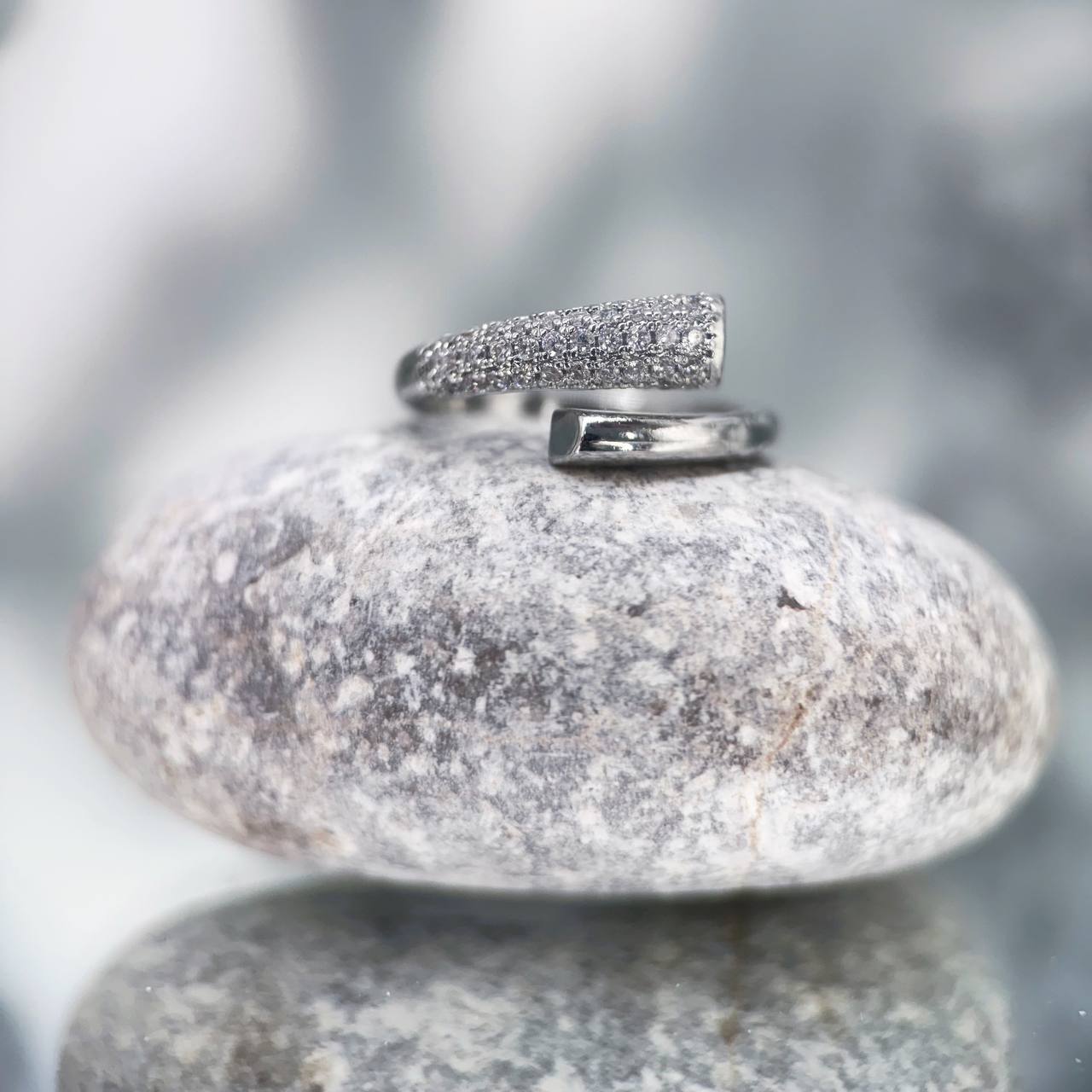 این حلقه یک قطعه کاملاً مجلسی و لوکس است. طراحی کاف باز دورپیچ آن، انگشت شما را به زیبایی در آغوش میگیرد و نیاز به تعیین سایز دقیق را برطرف میکند. یک طرف حلقه کاملاً با نگینهای ریز (میکرو سِت) پوشیده شده که در هر نورپردازی، نهایت درخشش و زرق و برق را ایجاد میکند. طرف دیگر ساده و صیقلی، تعادلی مدرن به ظاهر آن میبخشد. با رنگ نقرهای و ظاهر شبیه به جواهرات واقعی، انتخابی بینظیر برای مهمانیها و مراسم خاص است.
