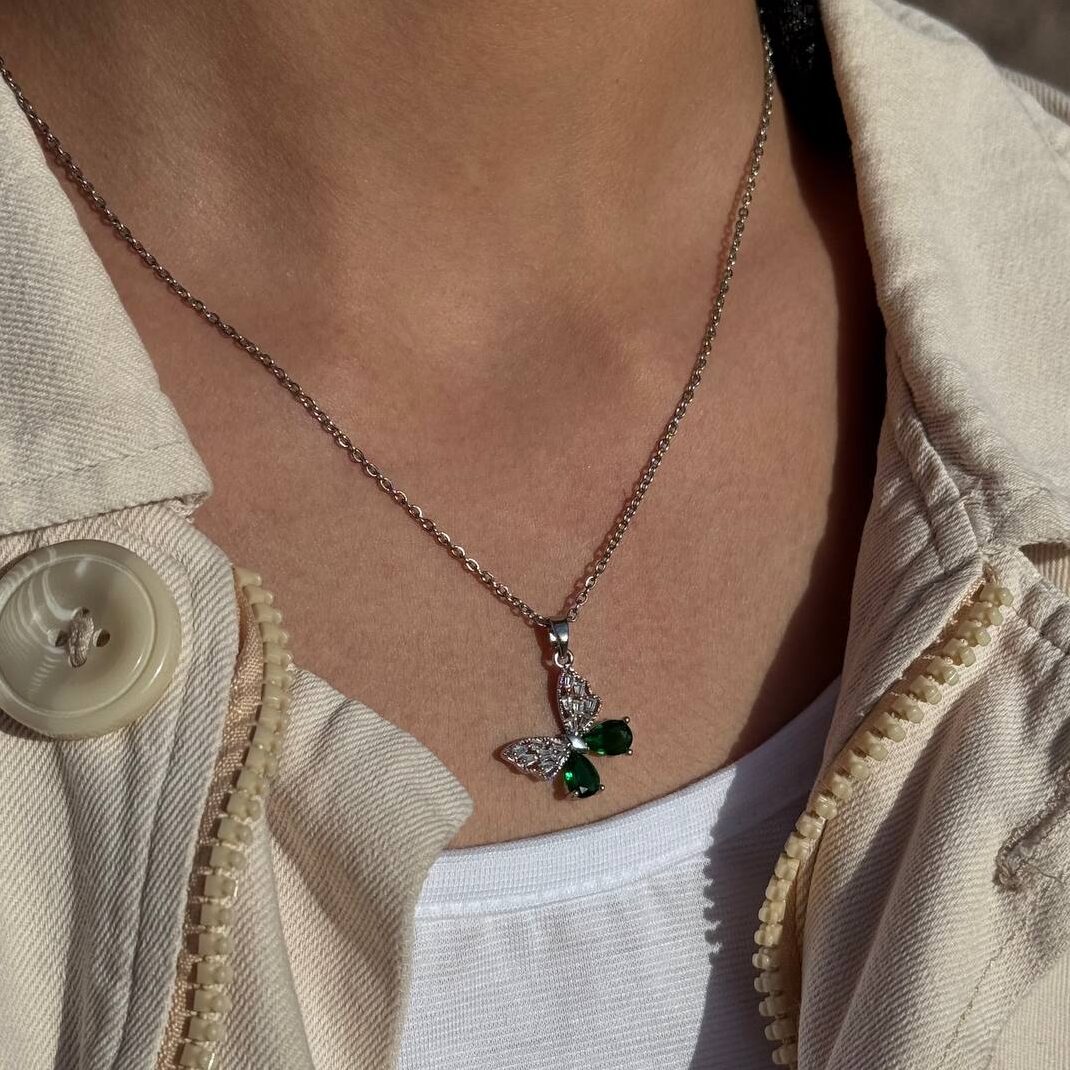 “رها”، تجسم زیبایی، سبکی و رهایی است. این گردنبند با طرح پروانه ظریف، نمادی از تحول و آغاز نو است. بالهای آن با نهایت دقت و ظرافت، با نگینهای درخشان و شفاف تزئین شدهاند و در مرکز، دو نگین اشکی شکل به رنگ سبز زمردی عمیق، زیبایی خیرهکنندهای به آن میبخشند.