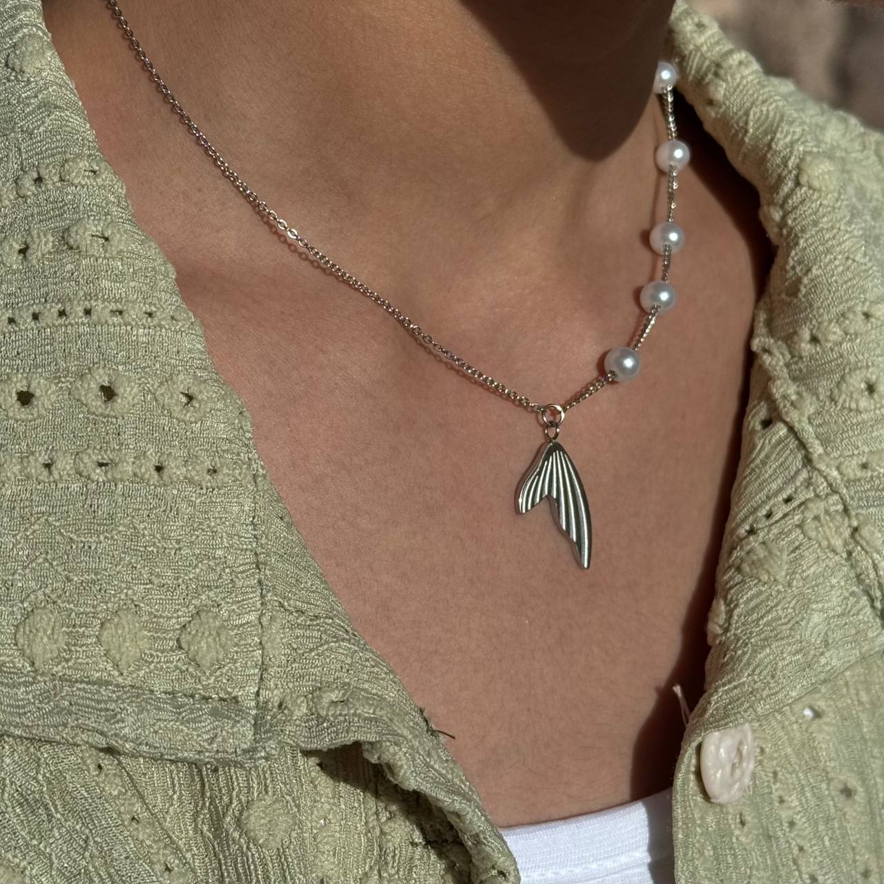 این گردنبند با زنجیری ظریف و مهره‌های مرواریدی درخشان، جلوه‌ای شیک و زنانه به استایل شما می‌بخشد. آویز دم‌ماهی که در انتهای زنجیر قرار گرفته، یادآور افسانه‌های دریایی و حس رهایی در امواج بی‌کران است؛ گویی هر بار که آن را به گردن می‌اندازید، بخشی از آرامش و انرژی مثبت دریا همراه شما خواهد بود